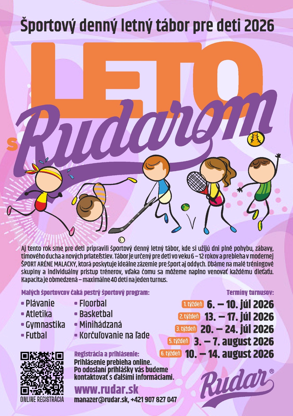 Doprajte svojim deťom leto plné športu, priateľstiev a nezabudnuteľných zážitkov. Aj tento rok pripravil Sport Club Rudar športový denný letný tábor, kde si deti užijú dni plné pohybu a zábavy. Deti sa môžu tešiť na širokú škálu tréningov pod vedením skúsených a kvalifikovaných trénerov: plávanie, atletika, gymnastika, futbal, florbal, basketbal a minihádzanú. Každý deň ich čaká kombinácia športových tréningov, tímových hier a súťaží, vďaka ktorým si zlepšia pohybové schopnosti a zároveň si užijú množstvo zábavy.